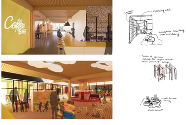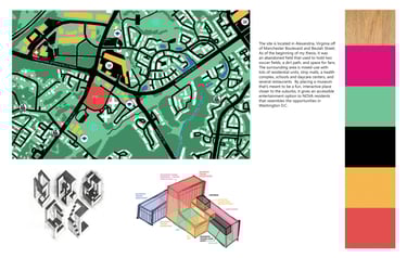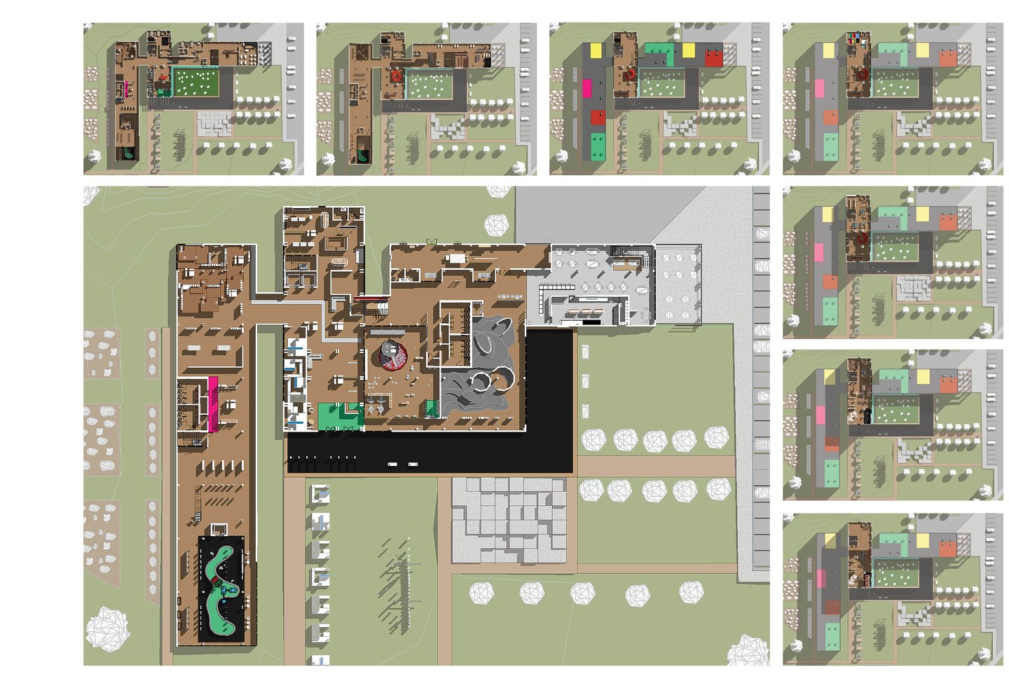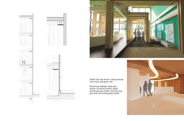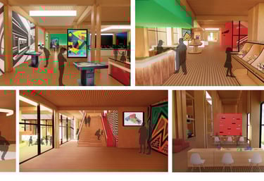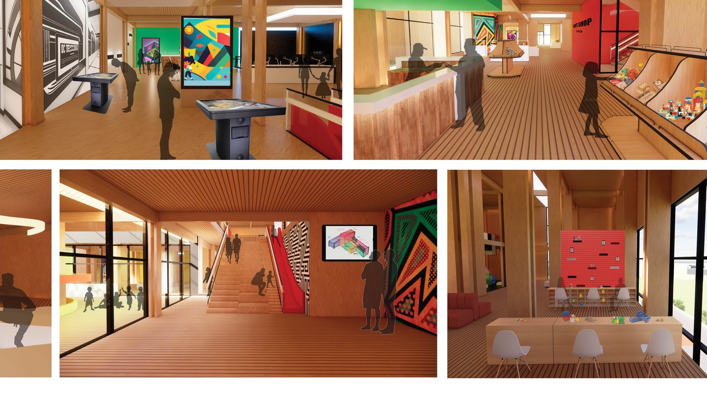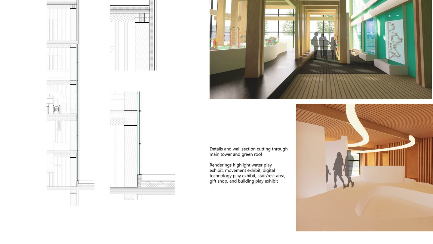 The Museum of Play is 75,000 SF and houses several exhibits focused on interactive exploration and learning with a variety of complexity to appeal to all age ranges. The 96’ tower is between two wings with colorful panels. Both sections of the building are based off of the architectural language explored in the cube studies, but they each have their own rules based on two of the corner studies. The overall form explores the interaction between these elements where they intentionally meet. Together, they form a landmark for the area that reaches out to welcome those who approach from the open garden area.